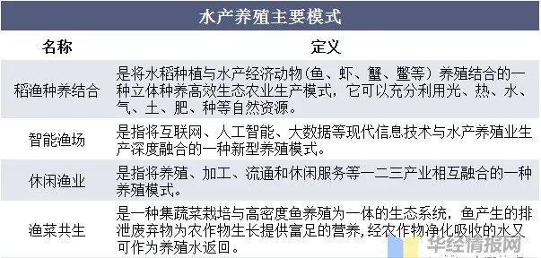水產養殖又被稱為養殖漁業,主要是在岸上由人工所開辟的魚塘中,養殖魚類或各種海鮮,以供食用。根據養殖水質的不同,可分為淡水養殖和海水養殖兩類。而隨著消費升級戰略提出,我國水產養殖的模式也在不斷創新,目前我國水產養殖已形成了稻漁種養結合、智能漁場、休閑漁業以及漁菜共生等幾種效率更高、更環保、更創新的運作模式。