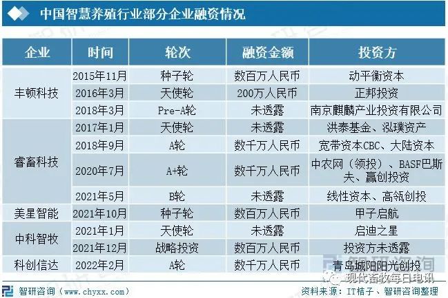 行業競爭者主要有、科創信達、科大訊飛等企業,行業廣闊的發展空間讓資本對行業內企業的發展前景十分看好,行業融資熱度較高,已有豐頓科技、睿畜科技等多家企業進行了多輪融資,投資方包括線性資本、高瓴創投、正邦投資等企業。