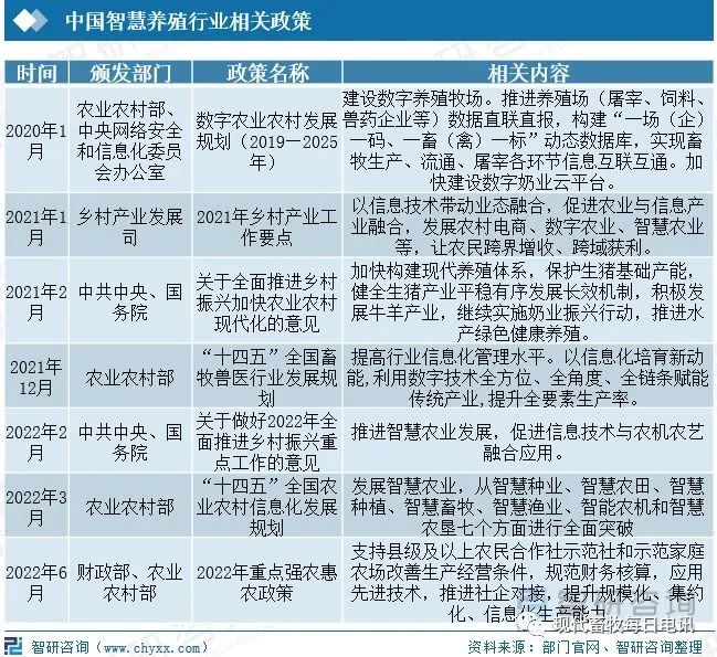 近年來,中國智慧養殖政策頂層設計加速完善,形成從基礎設施建設到技術推廣應用、社會化服務的完整政策體系,我國政府為推動智慧養殖建設,推動信息技術與養殖業生產經營融合發展發布了《“十四五”全國農業農村信息化發展規劃》、《“十四五”全國畜牧獸醫行業發展規劃》等一系列政策,明確表示將發展智慧養殖業作為“十四五”時期的重點任務之一,加快構建現代養殖體系,建設數字化平臺,推動生產、流通、屠宰等環節信息互聯互通。在政策支持下,我國智慧養殖建設將加速推進。