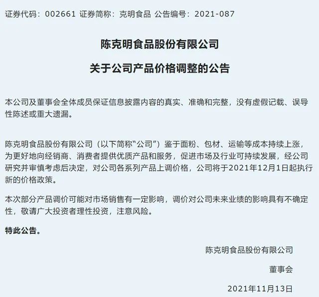 2021年11月,克明食品公告稱,對公司各系列產(chǎn)品上調(diào)價格,將于2021年12月1日起執(zhí)行新的價格政策,但未提及漲價幅度。這是這家“面業(yè)第一股”自2012年上市以來首次公告提價。
