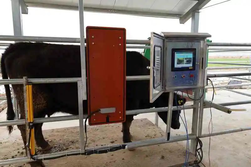 Δ河南省鼎元種牛育種有限公司核心育種場工作人員正在使用肉牛線性鑒定系統(tǒng)測定牛只體型數(shù)據(jù)。