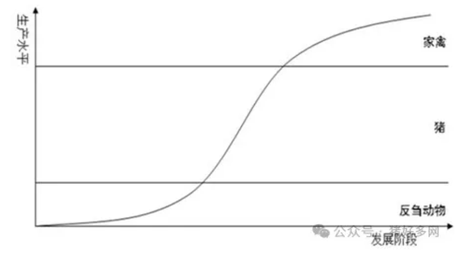 我國畜牧業(yè)的發(fā)展現(xiàn)狀和趨勢(shì)大致呈“S”型曲線(如下圖),家禽行業(yè)整體生產(chǎn)水平最高,處于高級(jí)發(fā)展階段;生豬行業(yè)整體生產(chǎn)水平和歐美國家相比差距還不小,處于中級(jí)發(fā)展階段;以PSY為例,發(fā)達(dá)國家可以達(dá)到30頭以上,我國平均水平只有20頭左右;尤其突出的是,企業(yè)之間的生產(chǎn)水平差距較大,還是以 PSY為例,先進(jìn)企業(yè)在26-27頭,落后企業(yè)可能只有 16-17 頭。反芻動(dòng)物生產(chǎn)水平則整體相對(duì)落后,除少數(shù)頭部企業(yè)外,普遍規(guī)模較小,生產(chǎn)效率較低,客觀上講仍然處于初級(jí)發(fā)展階段。