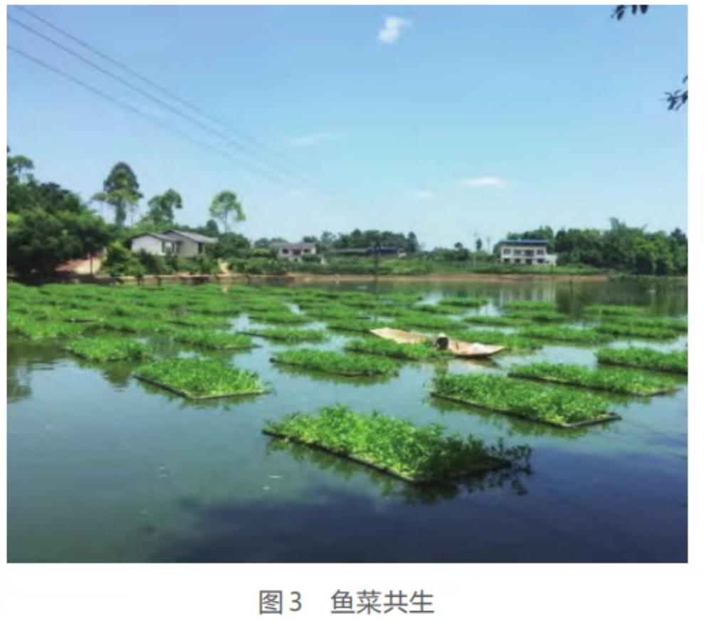 池塘魚菜共生是利用魚類與植物的共生互補特性(見圖3),在池塘水面進行無土栽培,將水產養殖和蔬菜種植有機結合,實現池塘“魚-水生植物”生態系統內物質循環,達到傳統池塘養殖的生態化、休閑化和景觀化三化融合效果,是一項可持續發展的生態型農業技術。池塘魚菜共生可實現池塘養殖廢棄物氮、磷等原位減控與消納利用,修復和保育池塘生態環境,提高養殖池塘綜合效益。