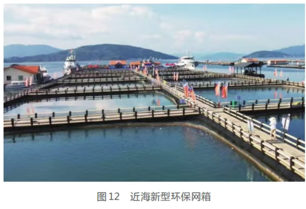 近海新型網箱養殖是將傳統木質漁排升級為塑膠養殖漁排(見圖12),將養殖泡沫浮球升級為塑膠浮球,利用升級改造后的新型網箱在近岸淺水區開展養殖,并配套自動投餌、智能監控等裝置的一種養殖技術。目前我國近海新型環保網箱養殖設施約有32.0萬個,容量為705.5萬m3,代表性養殖種類為大黃魚、許氏平鮋等,年養殖總產量約為13.9萬t。