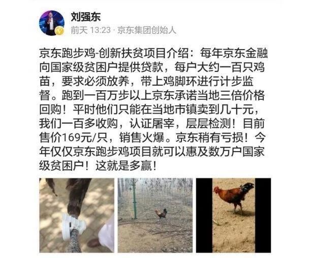 2017年5月份,京東創(chuàng)始人劉強(qiáng)東在微博上曬出京東跑步雞的扶貧項(xiàng)目介紹。這是京東切入養(yǎng)殖的第一個(gè)項(xiàng)目。