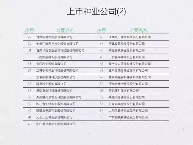 1997 年 4 月 22 日合肥豐樂種業(yè)股份有限公司在深圳證券交易所上市,成為中國種業(yè)上市公司的第一股。截止目前種業(yè)上市公司為 55 家,其中 A 股上市企業(yè)為 8 家,海外上市企業(yè)為 1 家 (奧瑞金)。其余種業(yè)公司主要在新三板上市。