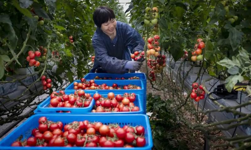 上海金山區現代農業產業園內上海金塘農業科技發展有限公司的番茄種植基地里,工作人員正在采摘小番茄。(上海金山區委宣傳部供圖)