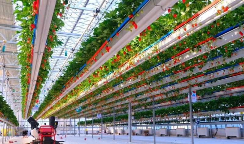 隔著玻璃門,只見一個智能機器人正在自動噴灑水肥,一排排果兒鮮艷的草莓掛在空中,地面寬敞、干凈……