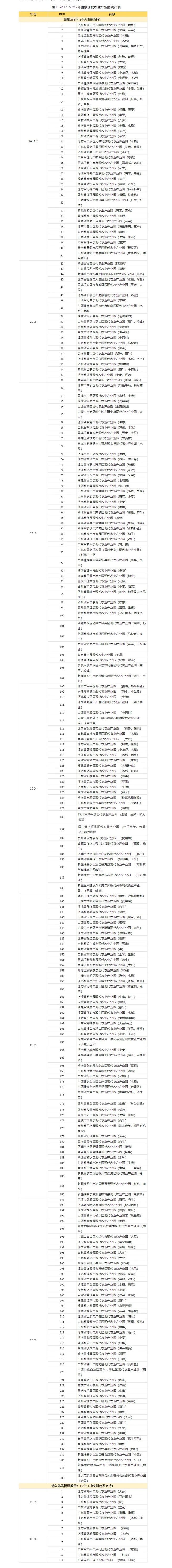 自2017年農(nóng)業(yè)農(nóng)村部、財政部啟動國家現(xiàn)代農(nóng)業(yè)產(chǎn)業(yè)園創(chuàng)建工作以來,國家現(xiàn)代農(nóng)業(yè)產(chǎn)業(yè)園其中批準創(chuàng)建238個,納入國家現(xiàn)代農(nóng)業(yè)產(chǎn)業(yè)園管理體系12個,共計250個。