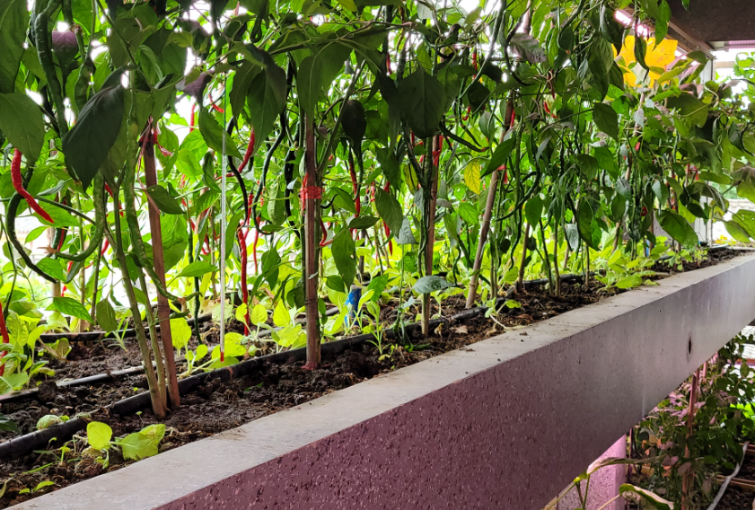 乘坐電梯從一樓到六樓屋頂,屋內設施與普通住宅毫無二致,但樓道和陽臺卻不一般,環繞著整棟建筑外,到處都栽種著時令蔬菜和果樹。低矮的桃樹上掛滿了成熟的桃子,茄子、豇豆、西紅柿遍布,還有當地有名的二荊條辣椒也成熟了。