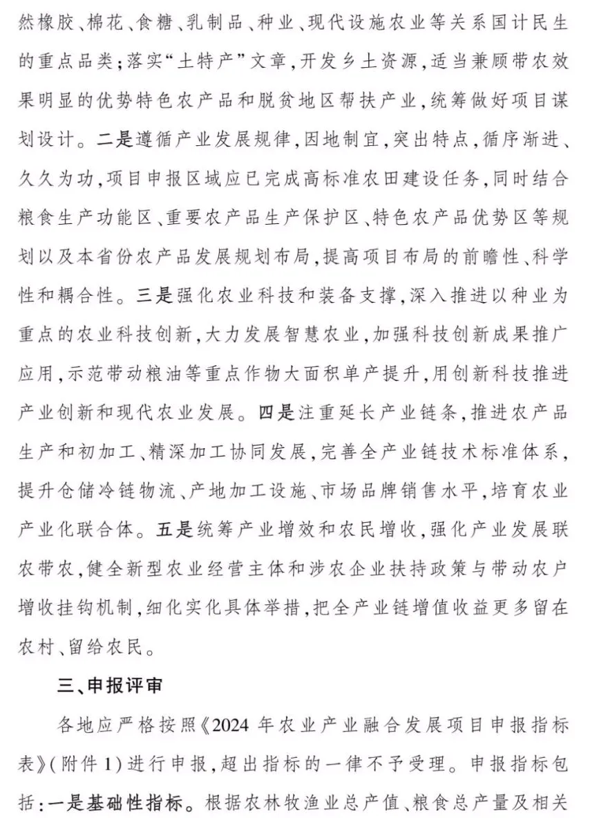 為更好發揮中央財政資金使用效益,引導和撬動更多資源要素向鄉村匯聚,促進鄉村產業全鏈條升級,提升鄉村產業發展水平,農業農村部、財政部2024年繼續統籌推進農業產業融合發展工作,具體申報通知如下: