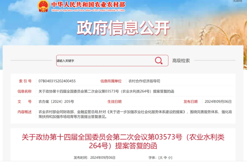 在政協第十四屆全國委員會第二次會議上,王新強委員提出的《關于進一步加強農業社會化服務體系建設的提案》第03573號(農業水利類264號)收悉。經商財政部、金融監管總局,現答復如下: