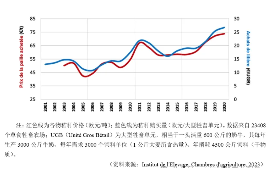 圖1 法國草食農場購買谷物秸稈的價格和購買量(2001年-2020年)
