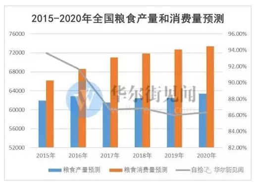 但出現(xiàn)了一個(gè)尷尬的狀況:糧食的自給率在下降。從統(tǒng)計(jì)局對(duì)“十三五”期間的糧食產(chǎn)量和消費(fèi)量的預(yù)測(cè)來(lái)看: