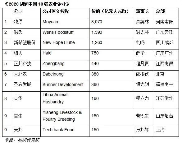 胡潤榜:中國農業十強企業集中在養殖和飼料領域