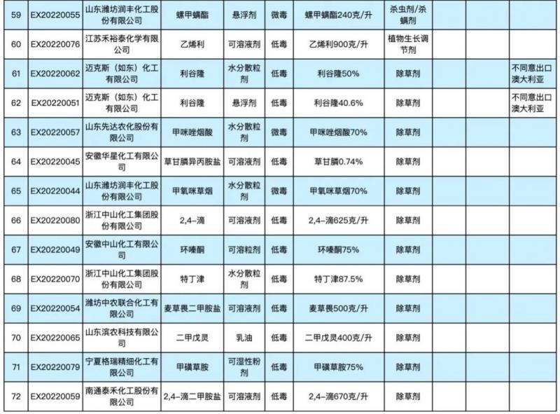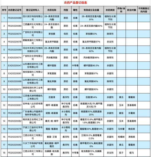 農藥登記信息:根據《農藥管理條例》《農藥登記管理辦法》等有關規定,經技術審查、全國農藥登記評審委員會評審,批準四川潤爾科技有限公司等53家企業的72個非新農藥產品登記(3個非新農藥產品部分登記),山東魯抗生物農藥有限責任公司等119家企業的166個農藥產品登記變更(3個農藥產品部分登記變更)。對批準登記及登記變更產品頒發《農藥登記證》、核準標簽內容(標簽內容見附件,不再核發紙質標簽)。