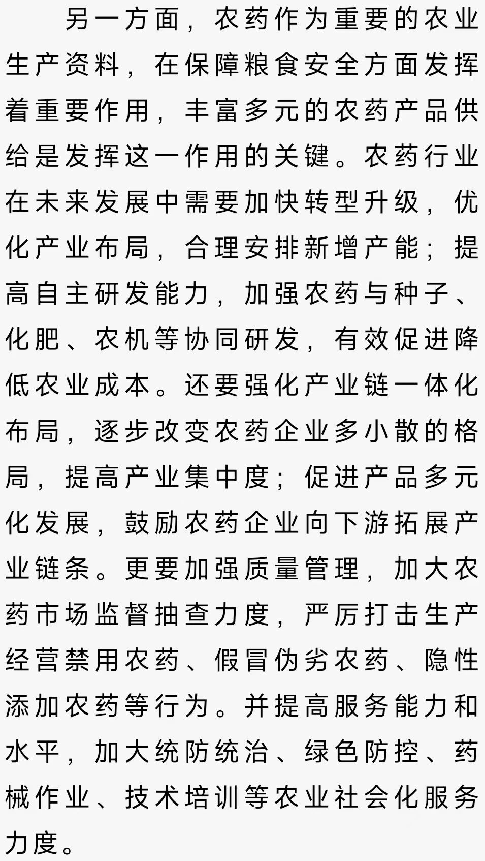 同時,國家推出多項有利于農藥行業創新、綠色、高質量發展的政策法規,進一步打造了良好的營商環境。在此環境下,去年農藥市場整體處于價格溫和回落的趨勢,第二季度、第三季度價格相對平穩,第一季度和第四季度下降趨勢相對明顯。農藥行業兼并重組有序進行,千億規模投資助力農藥產業鏈有序延伸,農藥企業產值規模和經濟效益整體繼續提升,行業集中度不斷提高。在市場供給方面,農藥產品穩定豐富,克服了上游原材料和能源價格上漲幅度大、物流受阻和成本高企等困難,為我國糧食安全作出重要貢獻。