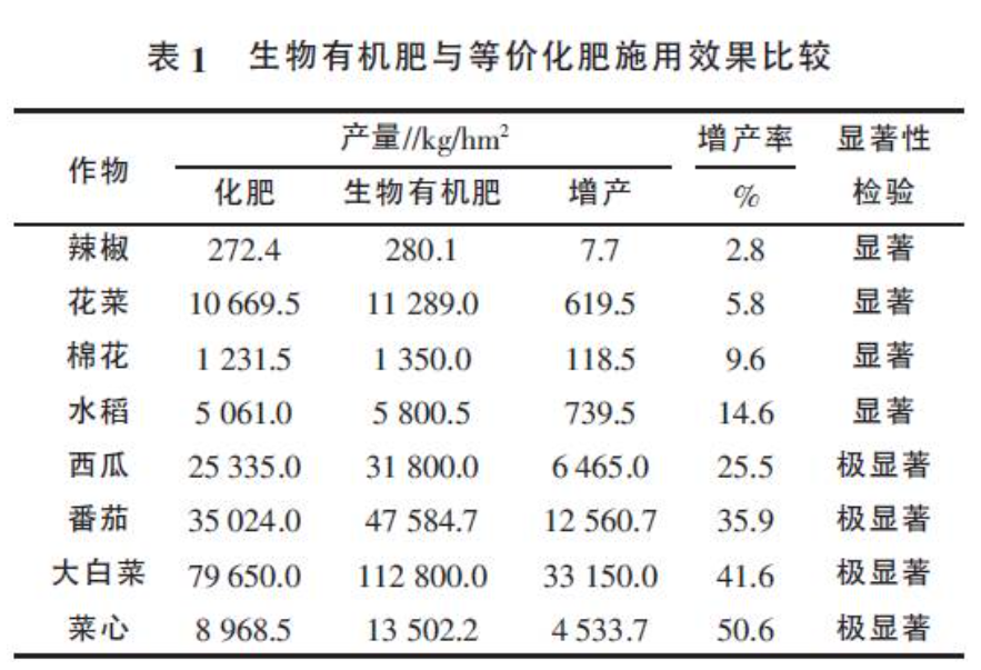 與施用等價的化肥相比,施用生物有機肥可使西瓜、番茄、大白菜、菜心分別增產25.5%、35.9%、41.6%、50.6%,達到極顯著水平,對辣椒、花菜、棉花、水稻等也有顯著的增產效果(表1)。據夏飚報道,與施用等價的磷酸二銨相比, 施用生物有機肥可使花生增產33%。