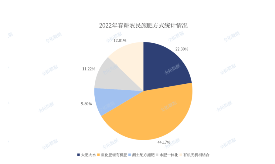 當前,我國既是肥料的生產大國也是使用大國,我國化肥總產量和消費量均占世界33%以上。依據2022年的春耕情況,數據顯示,農民施肥依然以重化肥輕有機肥為主,占比高達44.17%,但測土配方施肥(9.5%)、水肥一體(11.22%)、有機無機相結合(12.81%)的比重有逐步攀升,說明近年來隨著“藏糧于地、藏糧于技”國家戰略舉措的不斷實施和落地,我國新型肥料的使用已經得到響應普及,農業生產方式和習慣發生了很大變化,人們的科學種地和養地的意識逐步增強。