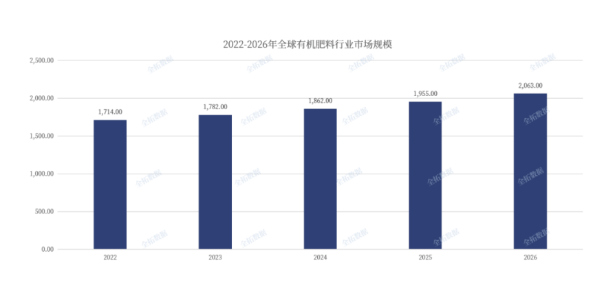 世界上很多國家,尤其是發達國家都制定、實施了有機肥資源管理政策。美國的許多地區在農業生產中積極開展諸如無害化有機肥、測土施肥等保護性耕作的研究。不同于我國實際使用有機肥占比不足20%的情況,西方國家有機肥料用量已占肥料使用總量的50%左右。數據顯示,2022年全球有機肥市場規模已增至1714億美元,并且隨著行業進一步發展與產品普及,預計2026年全球有機肥市場規模將達到2063億美元。
