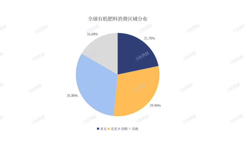 不難看出當前全球有機肥行業發展消費區域特征尤為顯著,主要集中在歐、美、亞等經濟較發達、種植業發達的區域。其中西歐地區有機肥使用量占比最高約為31.8%,北美約29.9%,亞太地區約占比21.7%,其他地區占比約為16.6%。
