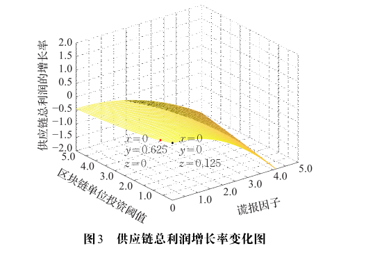 從圖3可以看出,隨著生產(chǎn)商謊報(bào)因子的增大以及區(qū)塊鏈單位投資閾值的增大,供應(yīng)鏈總利潤(rùn)的增長(zhǎng)率隨之下降。這是因?yàn)殡S著謊報(bào)因子的增大,區(qū)塊鏈單位投資閾值在下降,即能使雙方接受區(qū)塊鏈技術(shù)的最大成本在下降,說明技術(shù)應(yīng)用條件在不斷提高,總的供應(yīng)鏈成本上升使供應(yīng)鏈總利潤(rùn)的增長(zhǎng)越來越緩慢。而當(dāng)謊報(bào)因子大于1時(shí),供應(yīng)鏈的總利潤(rùn)增長(zhǎng)率恒小于0。因此,本文在討論區(qū)塊鏈技術(shù)應(yīng)用問題時(shí),考慮其謊報(bào)因子不大于1。與此同時(shí),由圖中點(diǎn)(0,0,0.125)易知,當(dāng)不存在謊報(bào)行為同時(shí)沒有區(qū)塊鏈技術(shù)投資成本時(shí),供應(yīng)鏈總利潤(rùn)的增長(zhǎng)率最大可達(dá)12.5%,而在實(shí)際供應(yīng)鏈中謊報(bào)行為時(shí)有發(fā)生,由此證明了本文研究的重要意義。由點(diǎn)(0,0.625,0)易知,使供應(yīng)鏈總利潤(rùn)增大的最大區(qū)塊鏈技術(shù)單位投資閾值為0.625,高于此值將不應(yīng)該應(yīng)用該技術(shù)。