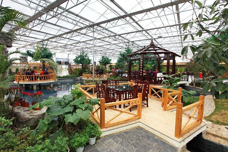 生態餐廳是綜合運用建筑學、園林學、設施園藝學、生態學等相關學科知識進行規劃、設計和建設,以設施調控技術、農藝栽培及管理技術來維護餐廳的優美環境,形成以綠色景觀植物為主,蔬、果、花、草、藥為輔的植物配置格局,結合假山、瀑布、小橋流水、竹木亭閣等園林景觀,全方位立體展現綠色、優美、宜人的就餐環境。