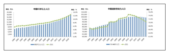 進入新世紀以來,中國人口老齡化趨勢加速,相應(yīng)適齡勞動力人口數(shù)量見頂回落。2019年中國總?cè)丝谕黄?4億,65歲及以上人口占比達12.6%,相比2000年水平(7.0%)提高了5.6個百分點。另一方面,15至65歲的適齡勞動力人口數(shù)量則在2013年達到10.06億的歷史高點,之后逐年回落,且近年來降幅有不斷擴大的趨勢,2019年已經(jīng)降至9.88億人,相比2013年減少了1800萬人。而適齡勞動力人口所占比重在2010年就已見頂(74.5%),2019年所占比重已經(jīng)降至70.5%,9年中降低了4個百分點。