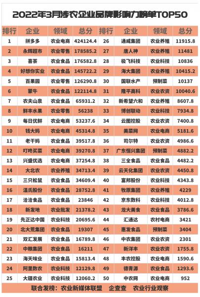 剛剛,農業新媒體聯盟、企查查、農業行業觀察聯合發布了《共譜鄉村振興·中國涉農企業品牌影響力3月榜單TOP50》,在50多家涉農企業的品牌輿情監測、自媒體運營、搜索引擎數據及口碑影響力排名結果中,拼多多、永輝超市、喜茶、好想你、百果園、蒙牛、北大荒集團、先正達中國、大疆農業、極飛科技、恒興集團、國聯水產、博創聯動、云天化集團、匯通達等企業紛紛入榜TOP50榜單;農業行業觀察透視發現,順勢而為是時代的抉擇,50家入榜的企業均在深耕或布局數字農業、預制菜、綠色農業、農業服務等熱門賽道。