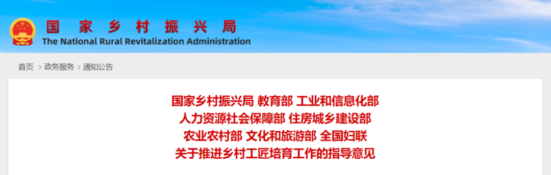 國家鄉村振興局 教育部 工業和信息化部 人力資源社會保障部 住房城鄉建設部 農業農村部 文化和旅游部 全國婦聯關于推進鄉村工匠培育工作的指導意見