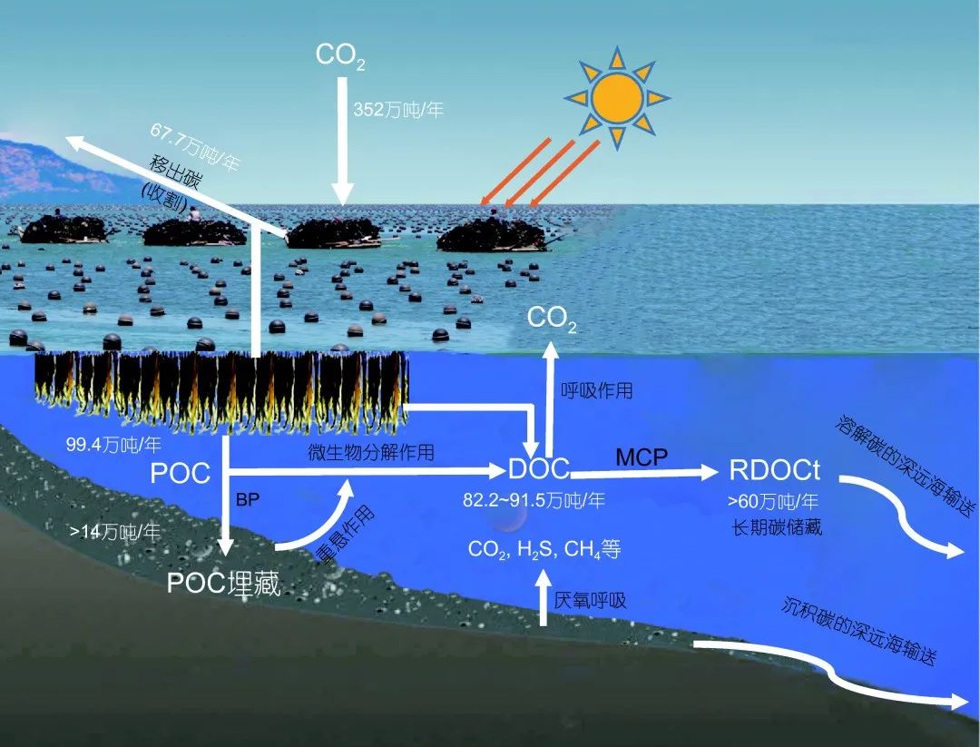 該技術模式通過選擇具有碳匯功能的養殖品種,建設生態化養殖設施,構建由魚類、貝類、藻類和底棲生物等組成的多營養層次綜合養殖模式,提高水體空間利用率,增加水產養殖效益,并以收獲、沉積等途徑將碳存儲,形成漁業碳匯。