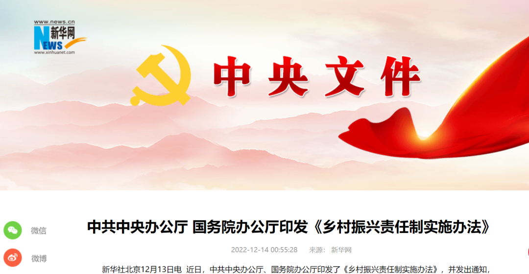 近日,中共中央辦公廳、國務院辦公廳印發了《鄉村振興責任制實施辦法》,并發出通知,要求各地區各部門認真遵照執行。