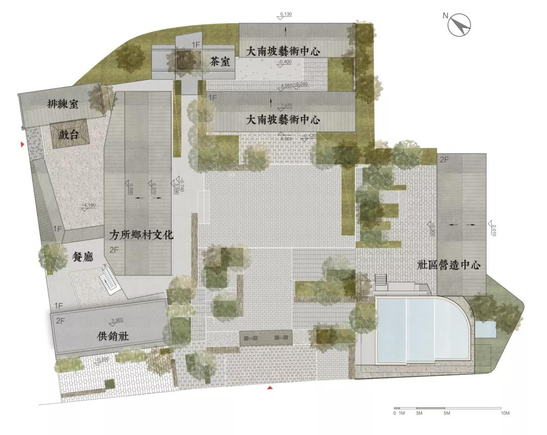 原大隊(duì)部建筑群由地形高差不同的三組院落組成。居中的院落為主院,旁邊的下沉院與主院之間有一層高差,高臺(tái)院約比主院地坪高約一米。經(jīng)過(guò)改造規(guī)劃,主院作為訪客進(jìn)入建筑群的主入口,涵蓋了大南坡藝術(shù)中心、茶室、方所鄉(xiāng)村文化空間等;高臺(tái)院則包括了社區(qū)營(yíng)造中心和辦公空間;下沉院主要以碧山工銷(xiāo)社焦作店、家宴餐廳及戲臺(tái)等空間組成。除茶室及家宴餐廳為部分新建外,其余均為舊建筑修繕改造。