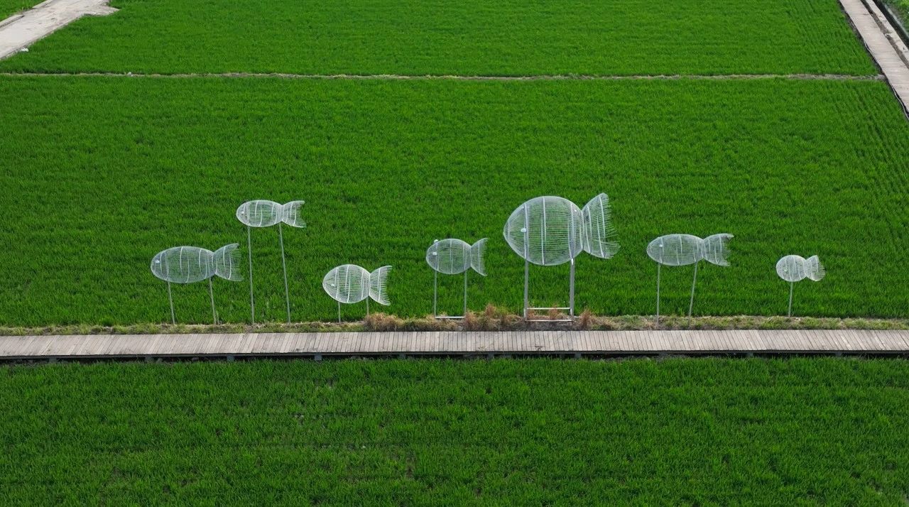 ▲農田的田埂建起了參觀廊道,引入了一些藝術家的設計作品