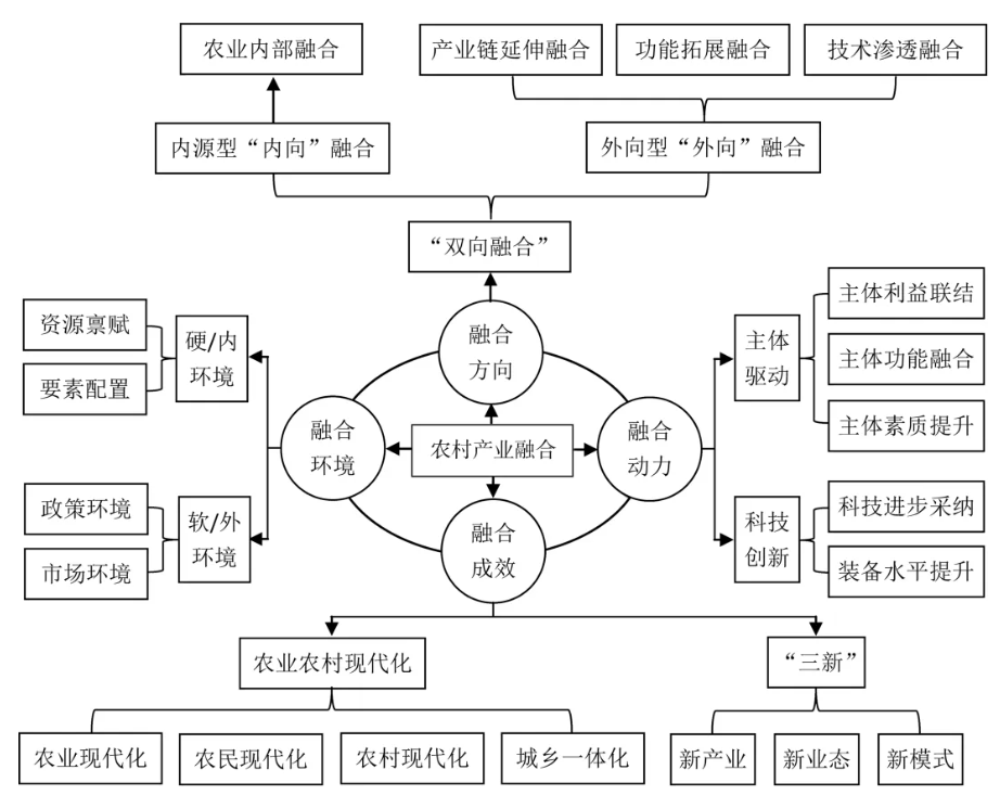 農村產業融合是農業產業化的高級形態,是以農業為依托、以農戶及相關生產經營組織為主體,基于各地的資源稟賦、政策環境和市場需求,通過整合、延伸、拓展、滲透等內源型與外向型“雙向融合”,帶動資本、技術以及其他各類要素資源優化重組,形成新產業、新業態、新模式的新型農業組織方式和體系,是基于多主體協同、多要素整合、多業態交互、多機制聯動、多模式推進而形成的一種互利關系的過程,其最終目標是實現農業農村現代化與高質量發展。