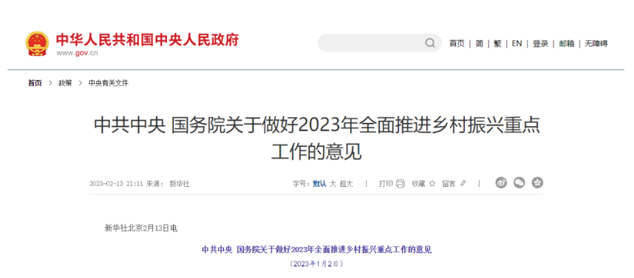《中共中央 國務院關于做好2023年全面推進鄉村振興重點工作的意見》