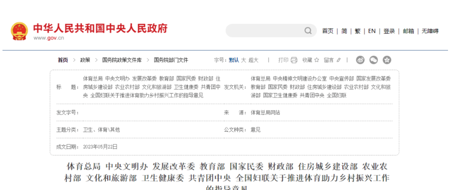 【發文機關】體育總局、中央文明辦、發展改革委、教育部、國家民委、財政部、住房城鄉建設部、農業農村部、文化和旅游部、衛生健康委、共青團中央、全國婦聯【發布時間】2023.05.22