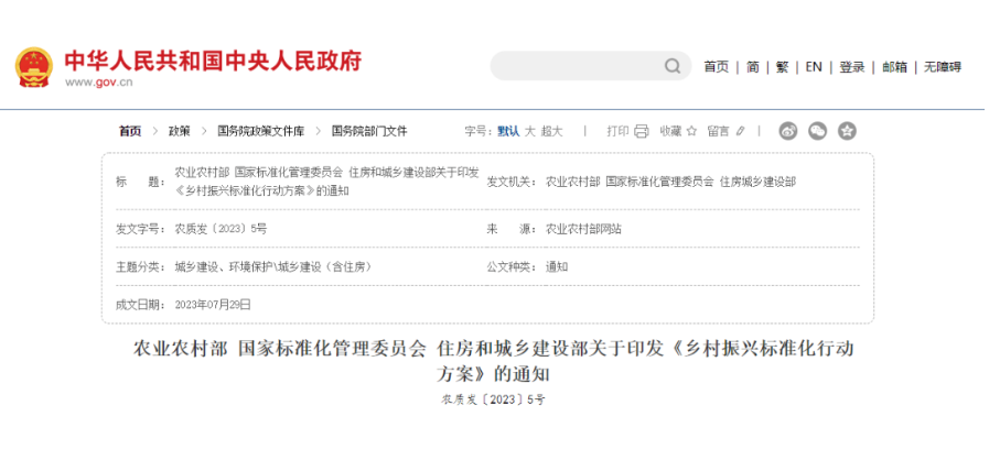 【發文機關】農業農村部、國家標準化管理委員會、住房和城鄉建設部【發文字號】農質發〔2023〕5號【發布時間】2023.07.29