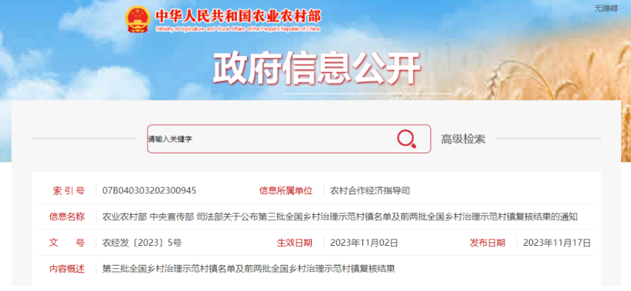 《關于公布第三批全國鄉村治理示范村鎮名單及前兩批全國鄉村治理示范村鎮復核結果的通知》