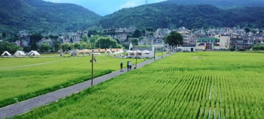 從昆明市區開車出發,半小時即可到達位于五華區西翥街道大村社區的“麥和稻田”。白色的外墻,青灰色的屋頂,加上落地玻璃窗,充滿文藝氣息的咖啡店讓人眼前一亮。沿著田埂上鋪就的棧道,從咖啡店向田間深處延伸,兩側放置著帳篷、露營椅、蒲墩,置身其中,讓人心曠神怡。