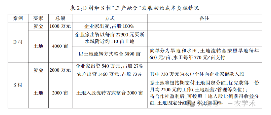 農(nóng)村“三產(chǎn)融合”發(fā)展過(guò)程啟動(dòng)離不開(kāi)資本、土地等要素整合投入,其中,資本要素最為稀缺。成本負(fù)擔(dān),作為發(fā)展過(guò)程啟動(dòng)的基礎(chǔ),旨在解決發(fā)展資源、資金從哪來(lái)的問(wèn)題。D村和S村啟動(dòng)“三產(chǎn)融合”發(fā)展過(guò)程均源于精英帶領(lǐng),經(jīng)歷了資本進(jìn)村、土地整理過(guò)程。案例村莊兩位精英帶頭人均利用自身資本積累和社會(huì)網(wǎng)絡(luò)資源為村莊發(fā)展帶來(lái)了機(jī)遇。但從兩村初始成本投入結(jié)構(gòu)來(lái)看,不同實(shí)踐路徑之間的差異明顯。以D村為代表的項(xiàng)目式發(fā)展路徑在啟動(dòng)發(fā)展時(shí)基本采用了外部轉(zhuǎn)嫁的成本負(fù)擔(dān)方式。村莊發(fā)展所需的1000萬(wàn)元初始發(fā)展資金均由外來(lái)企業(yè)家支付,村莊發(fā)展初始資本投資結(jié)構(gòu)單一。同時(shí),D村在整合土地資源過(guò)程中,一方面通過(guò)外來(lái)資本買斷方式獲取土地資源;另一方面在流轉(zhuǎn)農(nóng)戶土地資源時(shí)完全按照集中連片原則強(qiáng)勢(shì)流轉(zhuǎn),未考慮農(nóng)戶未來(lái)生計(jì)問(wèn)題。