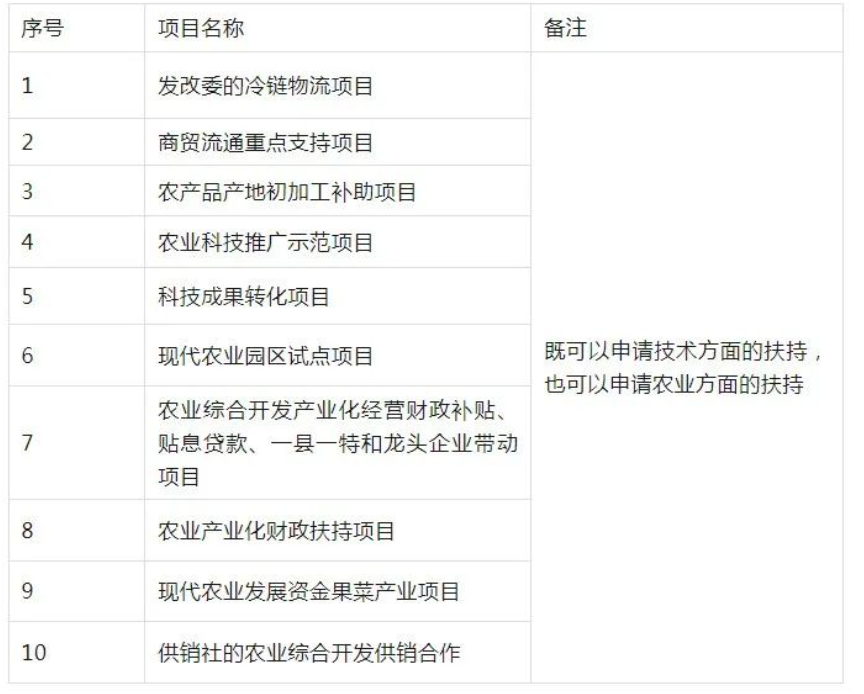 包括科技示范園、物流商貿園等形式,既可以申報技術方面的扶持,也能申請農業方面的扶持。具體項目見下表。