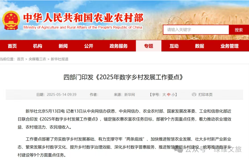 近日,中央網信辦、農業農村部等四部門聯合印發《2025 年數字鄉村發展工作要點》(以下簡稱《工作要點》),不僅提出了數字鄉村建設的目標和重點任務,也為鄉村文旅數字化發展帶來諸多利好。《工作要點》的出臺,標志著鄉村文旅數字化從 “局部探索” 進入 “全面攻堅” 階段。隨著 5G 網絡覆蓋、數字技術滲透和政策紅利釋放,鄉村文旅正迎來 “數字蝶變” 的黃金機遇期。