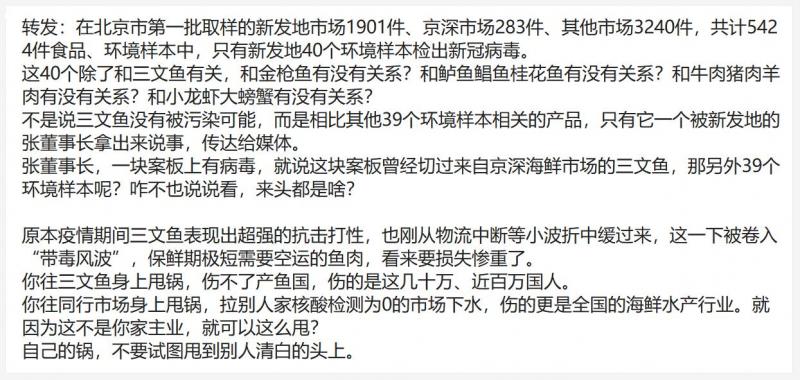 因為張董事長這么一出烏龍,無辜躺槍的北京京深海鮮市場將自14日起休市3天進行全面消毒。三文魚行業也遭到重創,多地市場與商超都緊急停售或下架三文魚,商戶損失慘重。更有業界人士呼吁,別讓一個謠言毀了一個行業。微信群中也不乏義憤填膺之士在振臂討伐。