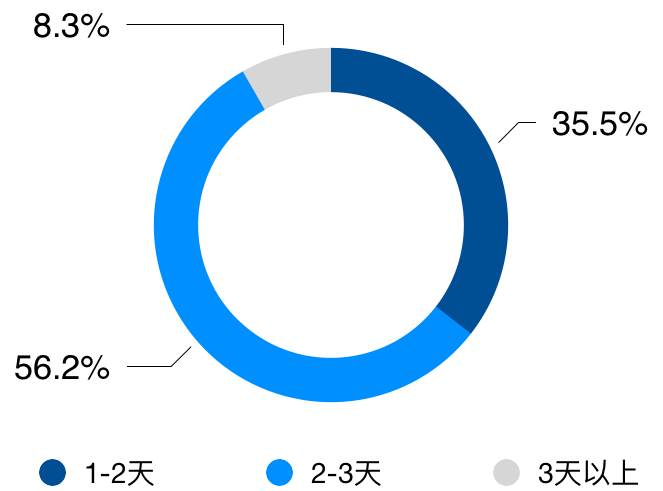 就當今旅游消費習慣來看,中國社會調查所 (SSIC) 的調查顯示,35.5%的被訪者傾向于停留“1-2天”;56.2%的被訪者選擇“2-3天”;8.3%的被訪者選擇“3天以上”,近九成的公眾更青睞3天以內的短途游。