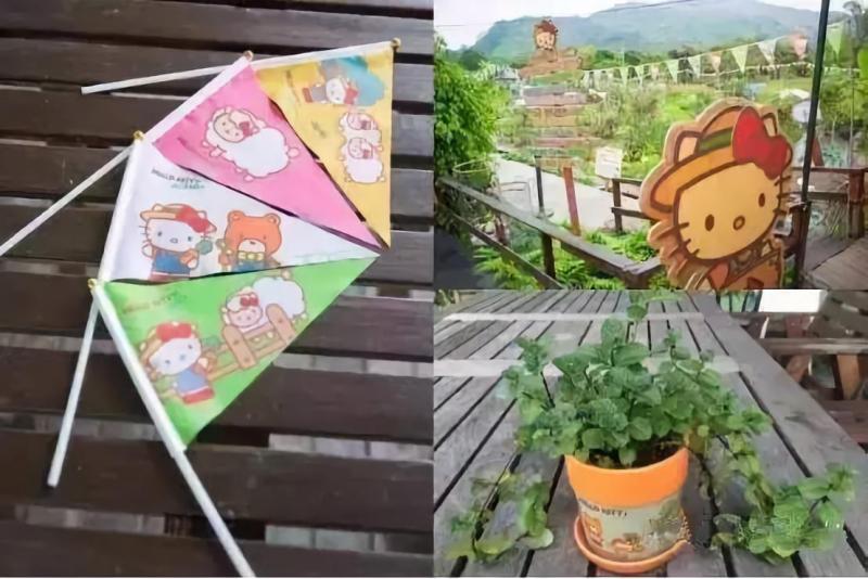 農(nóng)莊內(nèi)放置以農(nóng)夫?yàn)樵煨蔚腒itty 公仔和紙牌,供游客合影留戀。
