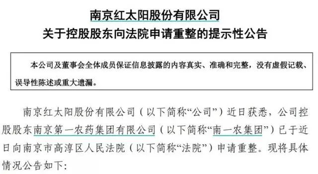 6月1日晚間,紅太陽發布公告稱,公司獲悉控股股東南一農集團已于近日向南京市高淳區人民法院(以下簡稱“法院”)申請重整。