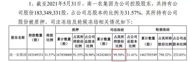 公告顯示,南一農集團所持有的紅太陽股份已有99.5%被司法凍結。