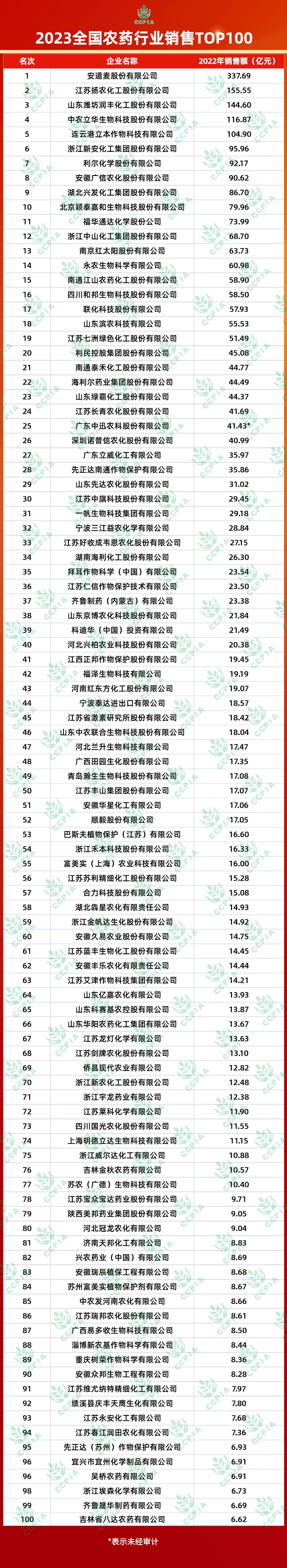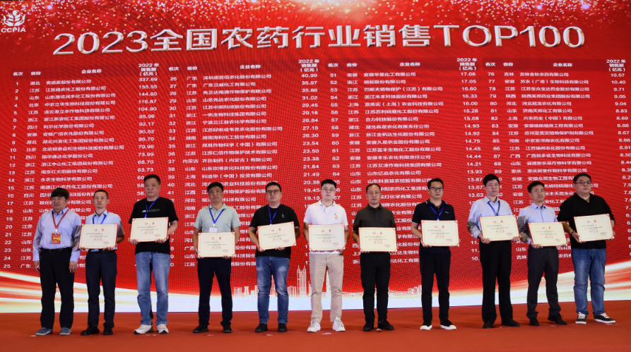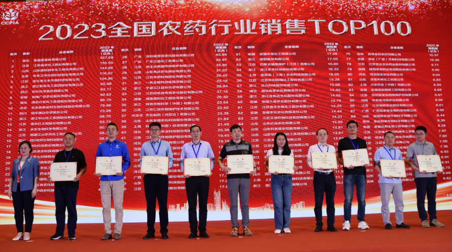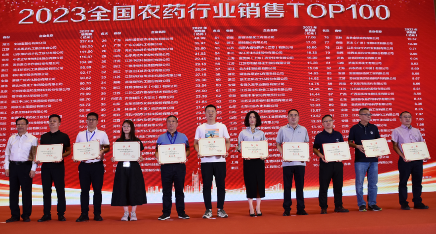 5月16日,安徽合肥,中國農藥工業協會發布了2023全國農藥行業銷售TOP100名單,安道麥股份有限公司以337.69億元的銷售額摘得桂冠,江蘇揚農化工股份有限公司銷售額達155.55億元,位列第二,山東濰坊潤豐化工股份有限公司銷售額達144.6億元,位列第三。