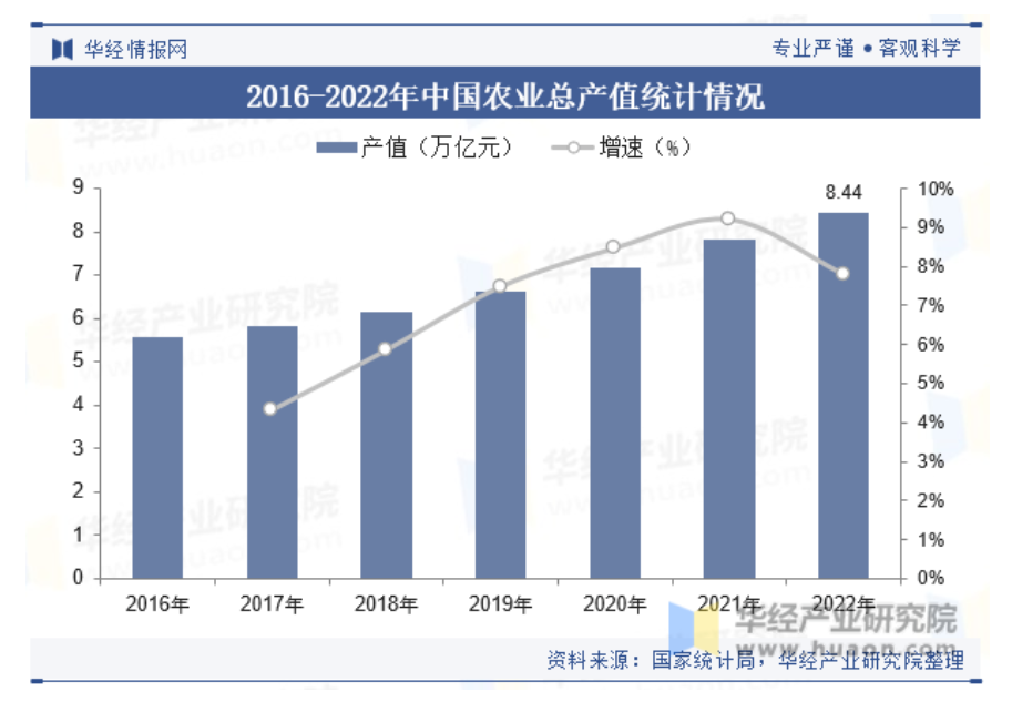 中國農業總產值呈現出逐年增長的趨勢,政府對農業的支持力度不斷加大,農業現代化進程正在加速推進。數據顯示,2022年我國農業總產值為84438.58億元,同比增長4.0%。隨著政府對農業的支持力度不斷加大,推廣農業科技、加強基礎設施建設等措施都有助于提高農業總產值。